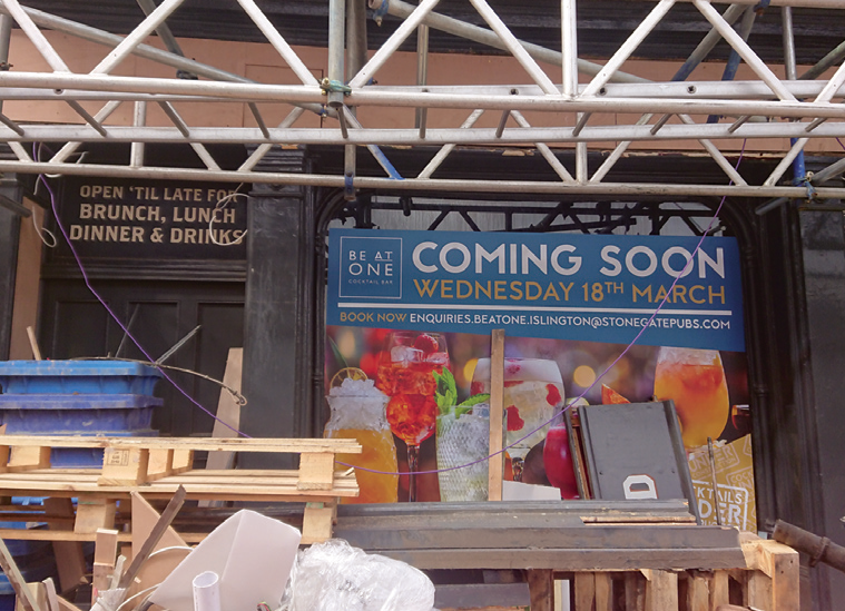 This once lovely pub on Upper Street is being converted by operator Stonegate to their ‘Be At One’ cocktail bar brand and, as such, will likely cease to be a pub under CAMRA’s definition. It was described on WhatPub as follows, ‘With a handsome, listed 18th century frontage, this is essentially a long extended narrow bar in which lots of interesting features have survived, such as the old wooden panelling and a nice window, with the pub name in prominent lettering. There are plenty of mirrors, old clocks and signs and two fine lanterns at the back to allow light and air in.’ The photograph does not encourage any optimism.