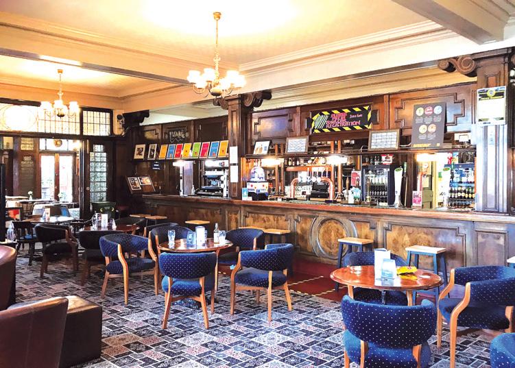 floor is now one large room wrapped around the servery. This is a more recent feature but sections of surviving floor tiling show where a larger and more substantial fitting once stood. What makes it special are the ornate details, notably the lovely tiled frieze on the back wall of the older part of the pub with its plain green tiles and statuesque rose bushes, reminiscent of the Glasgow School of Art. Above is a mottled alabaster band, then a decorative frieze with tendrils swirling round stylised rosettes. In the newer part (the former saloon) the treatment is different with a ceiling divided into bold panels with deep cornices and a high-level frieze with figures. The columns in the two areas are also different: thin Corinthian ones in the older area, chunky Ionic ones in the newer. On this occasion the upstairs function room was in use. The front part of this was once a restaurant whilst the back was almost certainly a billiard room and a very spectacular one at that, with a fine skylight. At the foot of the staircase is a unique feature for a pub; a ticket booth style shop for selling cigarettes and drink. This looks interwar, as do many of the features of the upper floor. The beer range on the day included Dragon Session Pale Ale from East London Brewing Co and Volden Session. There is no confirmed story as to the origin of the pub’s name but it was probably a tribute to Princess Alexandra of Denmark, who had married the future King Edward VII in 1863 and became Queen in 1901.