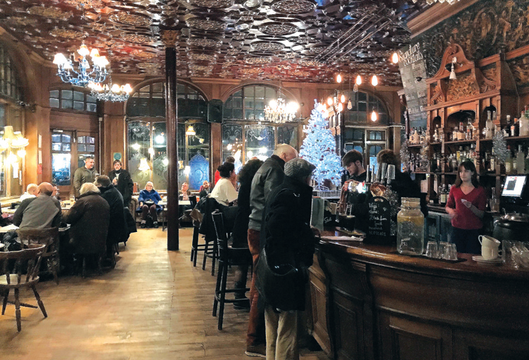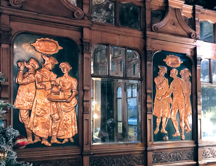 A few steps along Kilburn High Road, at number 274, is the Black Lion, truly one of the finest pub interiors surviving in the British Isles. This pub is not only Grade II* listed but is also on CAMRA’s National Inventory of Pub Interiors of Outstanding Historic Interest. It is described as an imposing corner-site pub built for Truman’s in 1898 to designs by architect R A Lewcock. It has a spacious, light interior, enriched with some particularly spectacular and appealing decoration. Pride of place goes to the series of four copper relief panels by designer F A Callcott depicting eighteenth-century ladies and gents at leisure at the supposed antecedent of the present pub. They are variously pictured enjoying a game of bowls, drinking and smoking, watching the inn sign being painted, and taking the waters at Kilburn Wells, the spa that lay nearby to the south. There is a deep and superbly ornate Florentine frieze in both main rooms and a richly decorated ceiling. When built, the main space would have been much more subdivided than it is now but there is still one screen surviving which was moved to its present position during a major refurbishment in 2003.