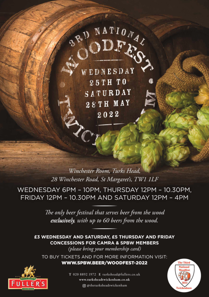 Barring unforeseen events, the 3rd WoodFest will finally take place this year, from 25 to 28 May at the Turk’s Head, 28 Winchester Road, St Margaret’s (near Twickenham) TW1 1LF. More details arbelow or look at our website: www.spbw.beer/woodfest-2022/.