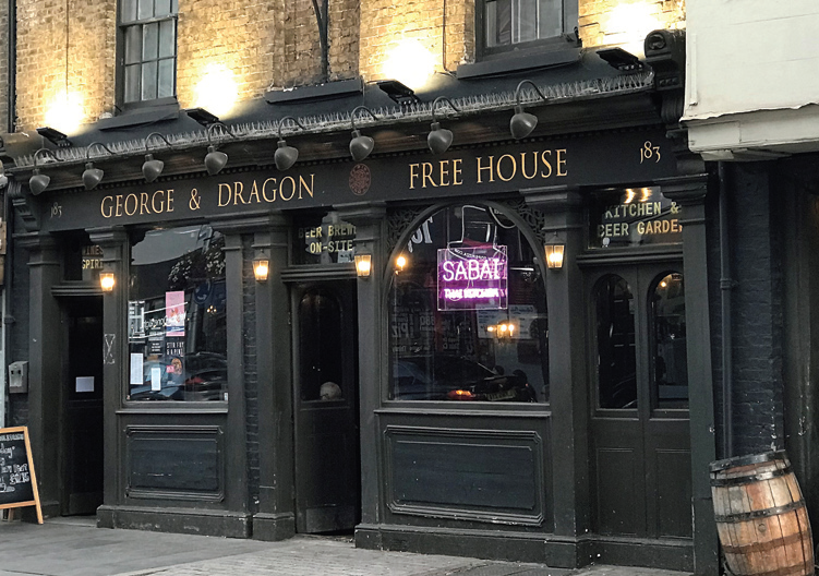 A happier prospect was the George & Dragon at 183 High Street, Acton. This pub is Grade II listed and is recognised by CAMRA as having a historic pub interior of local importance. The pub dates from two distinct periods: the left-hand side is 18th century with three storeys, sashed windows and painted brick while the right-hand side is 17th century with a timber frame, two storeys and a carriage entrance. The oldest pub in Acton, the interior is composed of three main areas. In the front bar a traditional counter servery was provided until quite recently, but this space is now used for seating and live music. Further on in is the characterful ‘heritage bar’, which has panelling and other woodwork and a stone fireplace, all probably from the 17th century. At the rear lies a modern large island servery, beyond which are large disused copper and chrome brewing vessels.