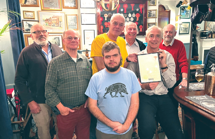 CAMRA’s Richmond and Hounslow branch’s Pub of the Year is the Jolly Coopers in High Street, Hampton. The photo shows branch chairman, Bob Gordon, surrounded by CAMRA stalwarts, presenting long established (since 1986!) licensee Nick Witham with the award certificate. The pub offers a wide range of ales and fine food in a welcoming, friendly local atmosphere. Nick and wife Jane recently also won a CAMRA Lockdown Hero award for their support for the local community during the pandemic.