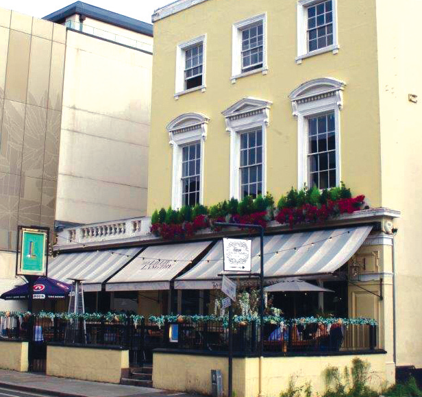 On leaving, I continued in the same direction along Lillie Road for about five minutes or so to North End Road and what is now called the Goose (SW6 1NL), standing on a very busy junction. Previously it had been named the Goose & Granite, Fulham Tap, Fulham Volunteer and originally the Crown. It is now a Red Cat pub. It’s a three storey sandstone brick building with white stone window surrounds, with the pub level painted dark blue. Inside it is surprisingly large, done out in a very traditional style in a general L shape, with an inner L shaped dark wood bar. This has a mirrored bar back and a large gold framed mirror. The floor is of polished dark wood but with one half carpeted. The seating is mainly dark wood and leather, with high and low chairs and leather benches. There is high wood panelling covering most of the wall and, going to the rear, on the way to the garden, there are some nice cosy booths. Supporting the ceiling are three iron columns with ornate tops. Again, there were several customers. I had the choice of two ales, Timothy Taylor Landlord and Doom Bar. I went for the Landlord but it went off so it had to be the Doom Bar which, at a reasonable £4.10, was actually very good.