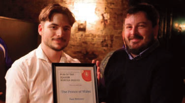 The Prince of Wales in East Molesey (KT8 9EU) is CAMRA’s Kingston & Leatherhead branch’s Winter Pub of the Season. The award recognises that branch members consider that both the quality and range of ales on offer has improved over the last year. Branch members gathered at this Greene King house on a Wednesday night in January to see the branch chairman, Richard Russell (right), make the presentation of a framed certificate to the manager, Ionnis.