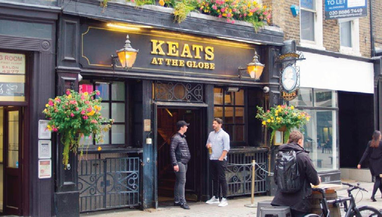 Carrying on in a northerly direction, crossing over London Wall, I got to Moorgate to find Keats at the Globe, previously called the Moorgate. This is an unusual set up because there are two pubs attached to each other, the other being the Grade II-listed Globe, around the corner. Keats is a small pub with a frontage of black woodwork. Inside, it’s long and narrow, going through to the next road and to an entrance to the Globe.
