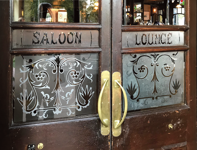 Another bus ride, to Turnham Green Station, took us to the Tabard. The Tabard is Grade II*-listed and has two stars on CAMRA’s National Inventory. The pub dates from 1880 and was a pioneering ‘improved’ pub built by architect Richard Norman Shaw as part of the Bedford Park estate, the first London garden suburb. Inside, there are colourful Arts & Crafts tiles featuring snakes and blue birds by William De Morgan. In the left hand bar there are a pair of two tile panels depicting nursery rhyme scenes, hand-painted in blue enamel on Dutch tin-glazed tiles. The pub retains two separate bars, although it also possible to move between them by two corridors. The bar-back is from a 1971 refurbishment but the counter looks original, although with a replacement top.