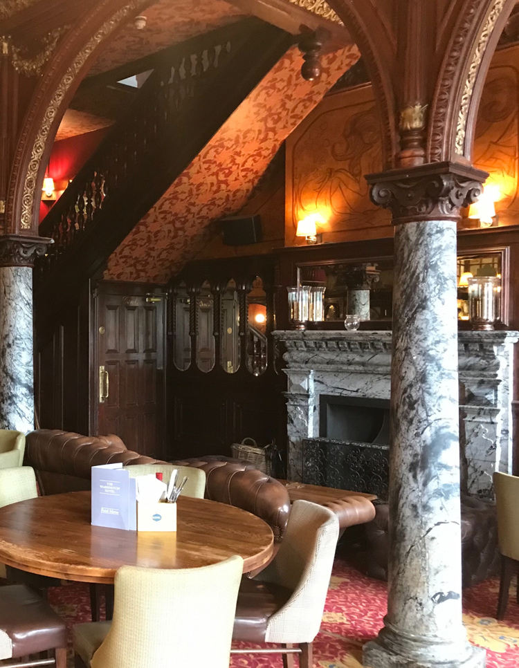 The evening commenced at the Warrington Hotel. The Grade II-listed building rates three stars on CAMRA’s Inventory of heritage pubs, being a pub of exceptional national historic importance. This substantial end of terrace pub was built in 1857 and underwent a magnificent refit, probably in the 1890s. The grand entrance porch is embellished with glorious tiled columns and an intricate mosaic floor that announces the name of the pub. On entering the luxurious right-hand room, the eye is first attracted to the elegantly curving semi-circular bar counter and the elaborate canopy above it. This counter looks out onto a spacious room that is another feast for the eyes.
