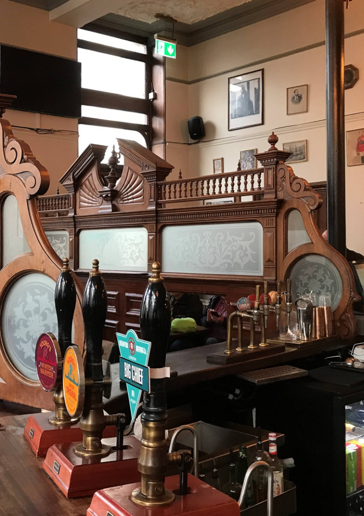 The work at the Prince Alfred introduced a peninsula bar servery, projecting out from the back wall, with five distinct compartments radiating from it, all divided by timber screens. The smallest of these was the ‘ladies’ bar’, a feature that survived until at least the 1980s. This area is distinguished by its rotating glazed screens (‘snob screens’) on the bar counter, which afforded greater privacy. At the rear, a billiards hall was added and is identifiable by the large rooflight above. The pub was first listed in January 1970 and the retention of its compartments was cited as a notable survival at a time when the opening out of pub interiors was commonplace. Two Redemption beers, Big Chief IPA and Rock the Kazbek, and Young’s Original are often served here.